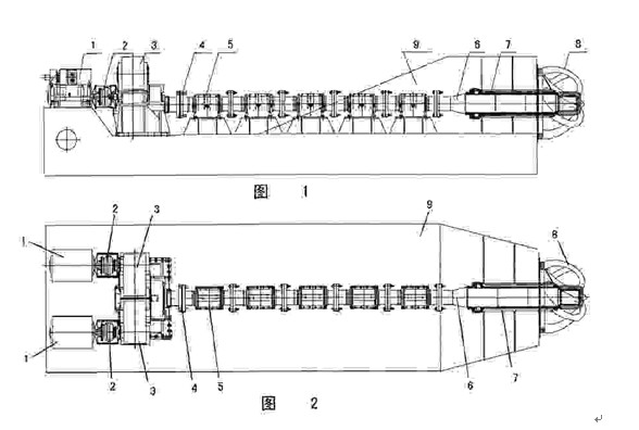 該雙電機(jī)驅(qū)動(dòng)絞刀傳動(dòng)系統(tǒng)包含變頻電機(jī)1、高彈性摩擦離合器2、齒輪箱3、中間傳動(dòng)軸4、中間支撐裝置5、絞刀軸6、絞刀支承軸承7和絞刀8。兩臺(tái)變頻電機(jī)1、兩個(gè)高彈性摩擦離合器2、兩個(gè)齒輪箱3分成兩組,均由橋架支承;每一組包括一臺(tái)變頻電機(jī)1、一個(gè)高彈性摩擦離合器2和一個(gè)齒輪箱3;高彈性摩擦離合器將變頻電機(jī)1和齒輪箱3連接起來(lái),變頻電機(jī)1通過(guò)高彈性摩擦離合器2將功率和轉(zhuǎn)速傳送到齒輪箱3上。高彈性摩擦離合器2起到柔性連接作用。并通過(guò)離合器內(nèi)部橡膠件調(diào)節(jié)系統(tǒng)剛度,##系統(tǒng)具有良好扭振性能。兩齒輪箱3成雙機(jī)并車結(jié)構(gòu)共同驅(qū)動(dòng)中間傳動(dòng)軸4。齒輪箱3有可承受雙向推力的軸承,絞刀工作時(shí)產(chǎn)生的軸向推力通過(guò)中間傳動(dòng)軸4傳遞到齒輪箱3的軸承上,##綜通過(guò)齒輪箱地腳鉸制螺栓傳遞到橋架9上。在兩臺(tái)變頻電機(jī)1同時(shí)工作時(shí),可以對(duì)兩臺(tái)變頻電機(jī)1同時(shí)進(jìn)行控制,從而能滿足兩臺(tái)變頻電機(jī)1均勻負(fù)載。齒輪箱3與中間傳動(dòng)軸4聯(lián)接。中間傳動(dòng)軸4與絞刀軸6聯(lián)接。每一中間傳動(dòng)軸4均由一中間支承裝置5來(lái)支承。中間支承裝置5包括高分子復(fù)合材料軸承,中間傳動(dòng)軸4可轉(zhuǎn)動(dòng)地穿過(guò)高分子復(fù)合材料軸承。高分子復(fù)合材料軸承使用海水海水潤(rùn)滑和冷卻,具有彈性好、耐磨性好的特點(diǎn)。中間支承裝置5通過(guò)地腳鉸制螺栓緊固在橋架9上,可以有效地起到支撐中間傳動(dòng)軸4自身重量以及運(yùn)轉(zhuǎn)產(chǎn)生的徑向力作用。絞刀支承軸承7是高分子復(fù)合材料軸承,對(duì)橋架9振動(dòng)具有良好的減震和吸震作用,同時(shí)對(duì)于橋架9的不規(guī)則變形具有良好的位移補(bǔ)償能力。