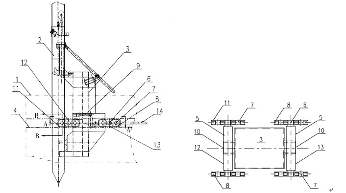 船體1、鋼樁2、臺車主體結(jié)構(gòu)3、軌道4、平衡梁5、墻架轉(zhuǎn)軸6、滾輪轉(zhuǎn)軸7、行走滾輪8、緩沖裝置9、平衡梁轉(zhuǎn)軸10、滾輪墻架11、##行走軛架12、第二行走軛架13、行走油缸14