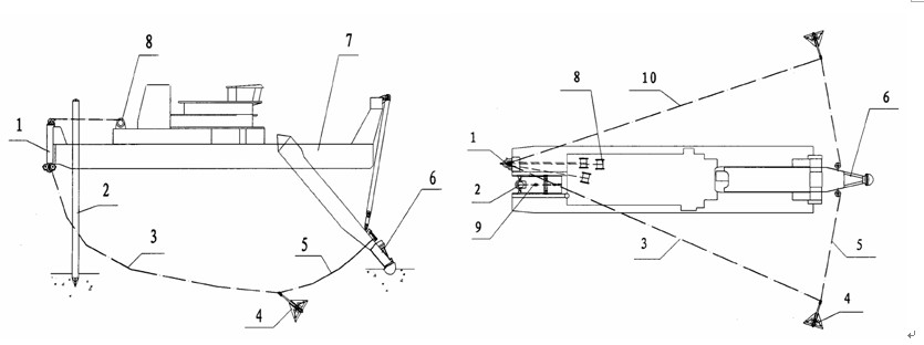6--挖泥頭,7--挖泥船,8--絞車,9--臺車,10--左邊纜。