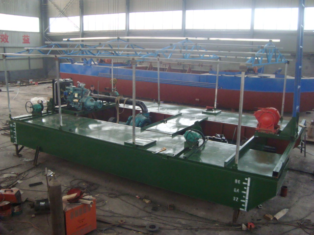 本設(shè)備為三體組裝式抽沙船,拆裝方便,整體尺寸都是按照集裝箱空間體積設(shè)計(jì)制造的(整個設(shè)備能裝入一個40尺的超高柜),有效節(jié)省了海運(yùn)費(fèi),便于國際間長途運(yùn)輸。抽砂泵使用了國內(nèi)##的石家莊大唐泵業(yè)有限公司的合金耐磨疏浚泵,葉輪使用壽命長(1年以上),大大降低了設(shè)備的維修率。主動力采用的是濰柴BL6113AZLG柴油機(jī),動力強(qiáng)勁,操控自如。主機(jī)艙部分采用了防雨棚設(shè)計(jì),增加了操作人員的舒適度,也有效加強(qiáng)了柴油機(jī)等的防雨防銹。