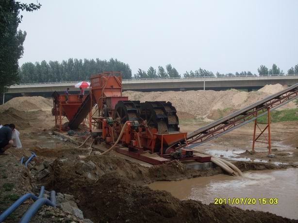本設備由上料斗、上料傳送機、滾筒篩、制砂機、兩道輪式洗沙機組成,可用于風化山沙、含鵝卵石和土比較多的河沙等物料的處理。每小時的處理量為60-80立方米。
