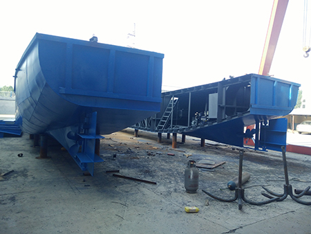 發(fā)往斐濟共和國的制造中的100噸近海甲板駁船。濰柴船用機、杭齒變速箱、ccs級